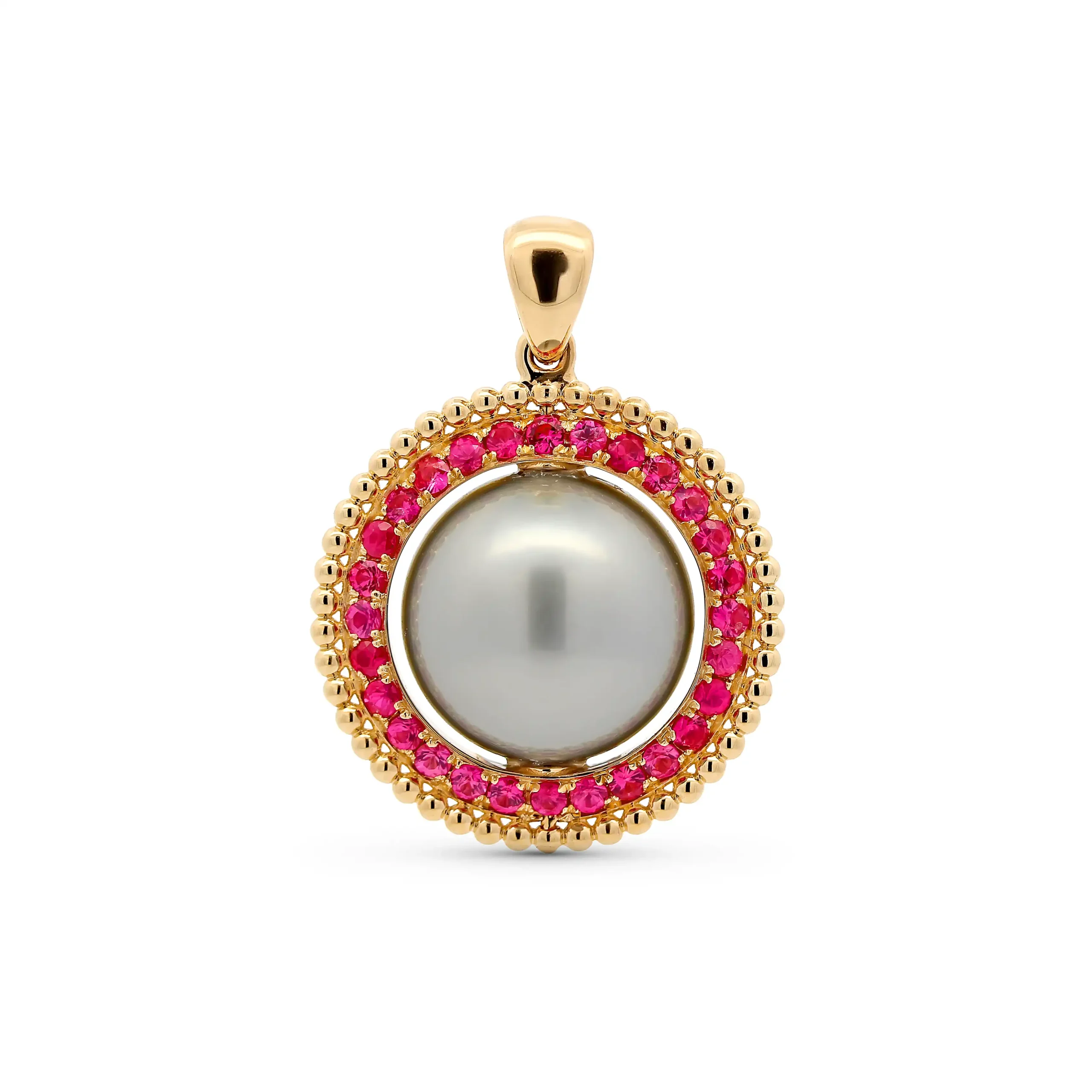 Solid 14k Tahitian Pearl Ruby Halo Pendant