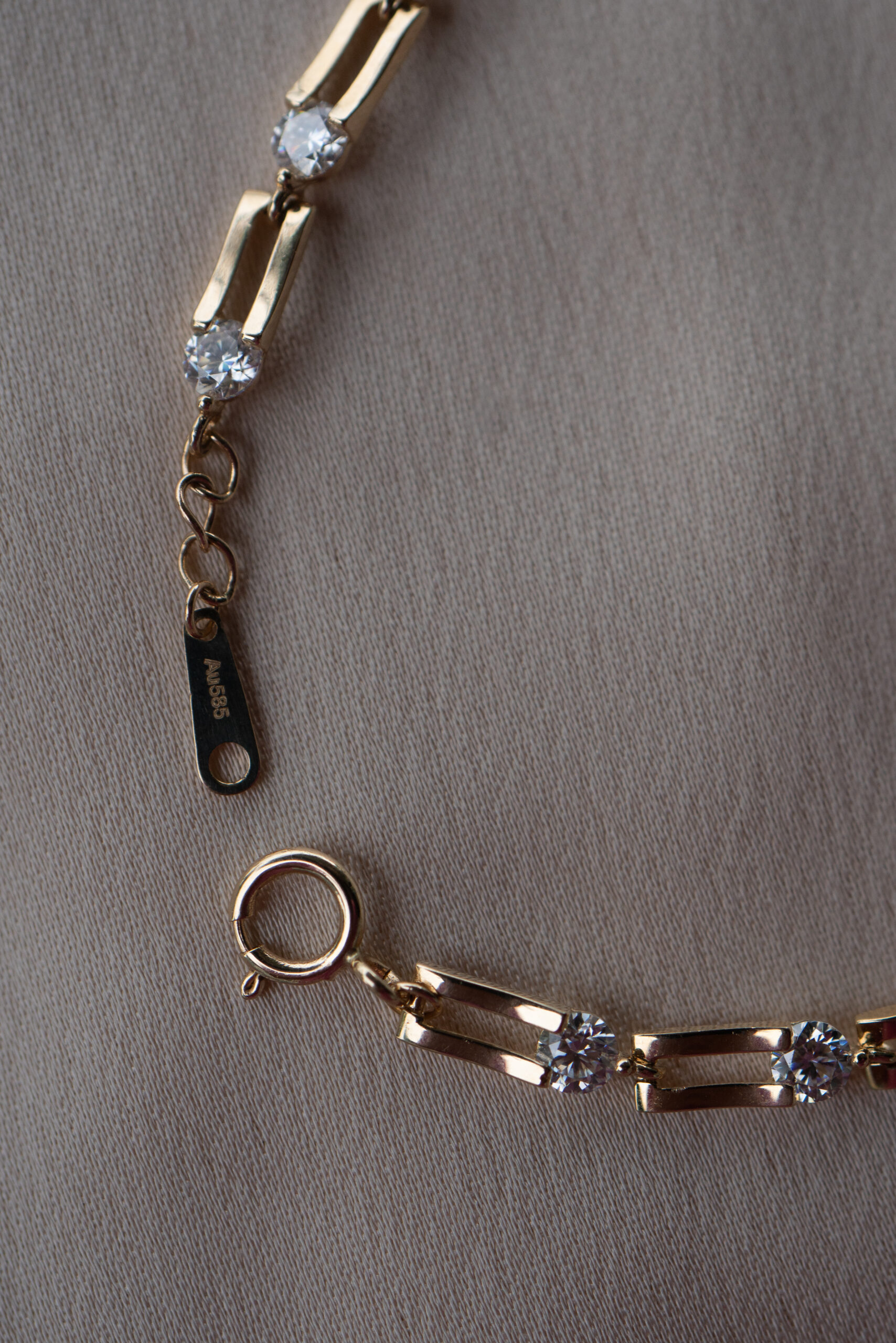 The Axis Tennis Bracelet has a rhythm to it — long, polished gold bars paired with bright stones that break the line just enough to make your eye follow the pattern. The shape feels intentional, almost architectural, with each link creating a smooth flow around the wrist.